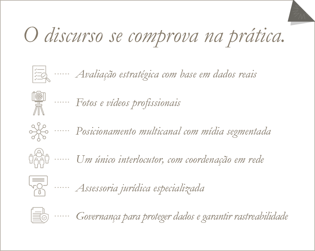Na MAPI, a gestão é exclusiva e coordenada. O cliente escolhe sua representante, que lidera a estratégia replicada por toda a rede, com planejamento, coerência visual e narrativa. Informações alinhadas, imagens bem curadas.